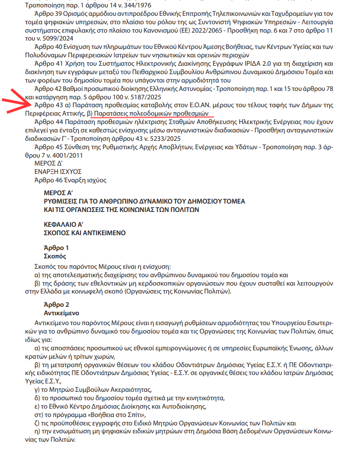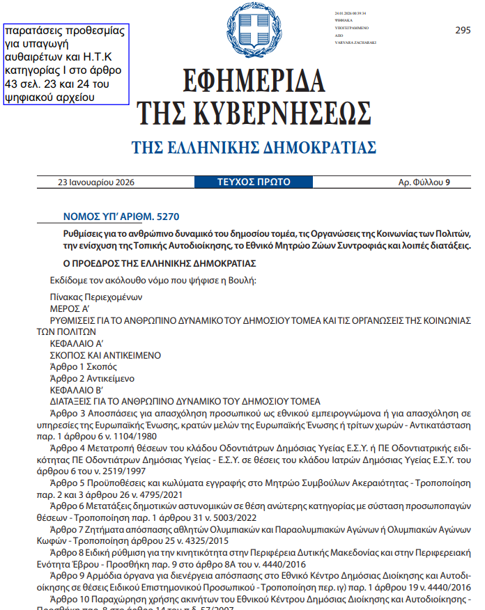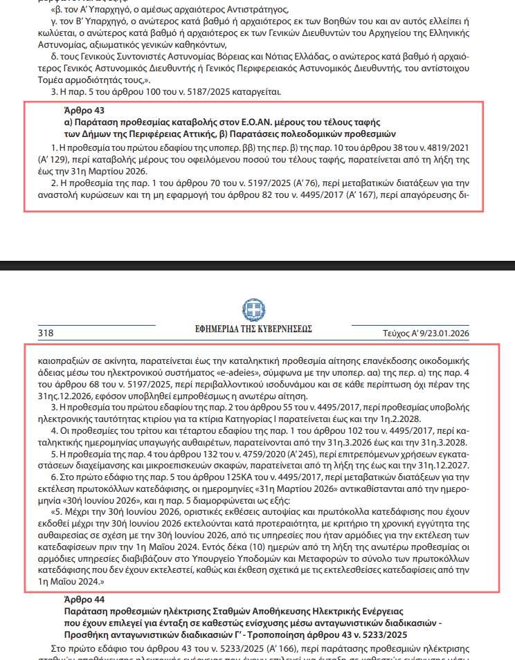 Παρατάσεις για υπαγωγή αυθαιρέτων και Η.Τ.Κ ακινήτων κατηγορίας Ι- Ν. 5270/26 (ΦΕΚ 9/Α/23.1.2026) Άρθρο 43 στις σελίδες 23 και 24 του ψηφιακού αρχείου.