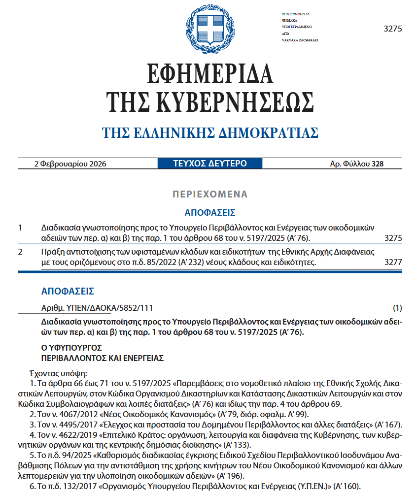 σε ΦΕΚ η απόφαση για « Διαδικασία γνωστοποίησης προς το Υπουργείο Περιβάλλοντος και Ενέργειας των οικοδομικών αδειών των περ. α) και β) της παρ. 1 του άρθρου 68 του ν. 5197/2025 (Α’76)
